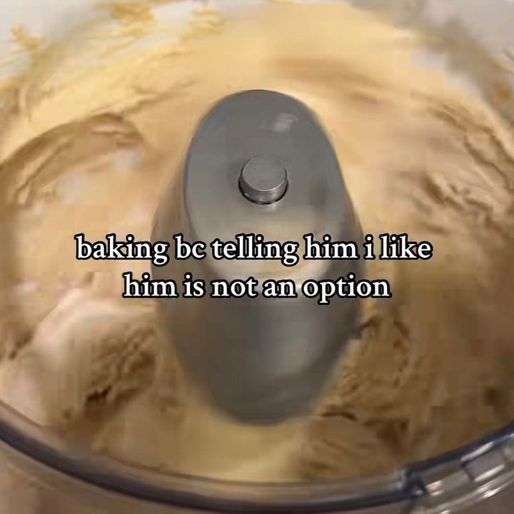 I’ve noticed a lot of people on social media feel this way too, using baking as a distraction when they have a crush. Does anyone know the exact science behind this? Do we hope the process of baking a cake will make us feel better? I don’t have the answers.