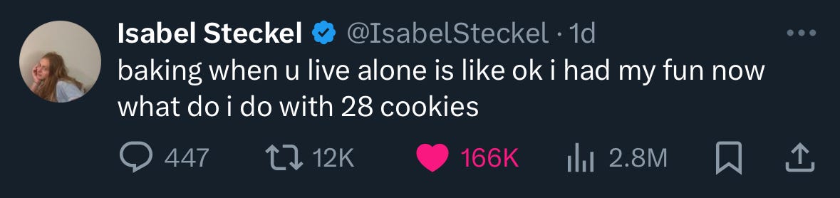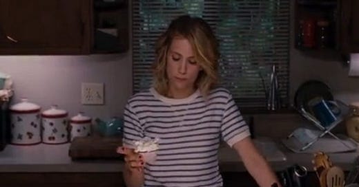 Before you ask, I’m making Brown Butter Miso Chocolate Chip Cookies (thank you butternutbakeryblog) which I’ve been perfecting for a while now, preparing batches every few weeks. They’re very delicious and once I’m done I’ll have a midnight snack that I can dunk in a glass of cold milk. Sometimes I feel like Jenna in ‘The Waitress’, wearing an apron and making elaborate and exciting pies from scratch, wondering if this culinary journey will lead me down a path where I open a bakery or start some cookie side hustle in my garage... Last week I made a sour cream coffee cake with crumb topping so I think we’re getting close. I resonate with Annie in ‘Bridesmaids’ too, especially when she makes a fancy cupcake and then eats it on her own.